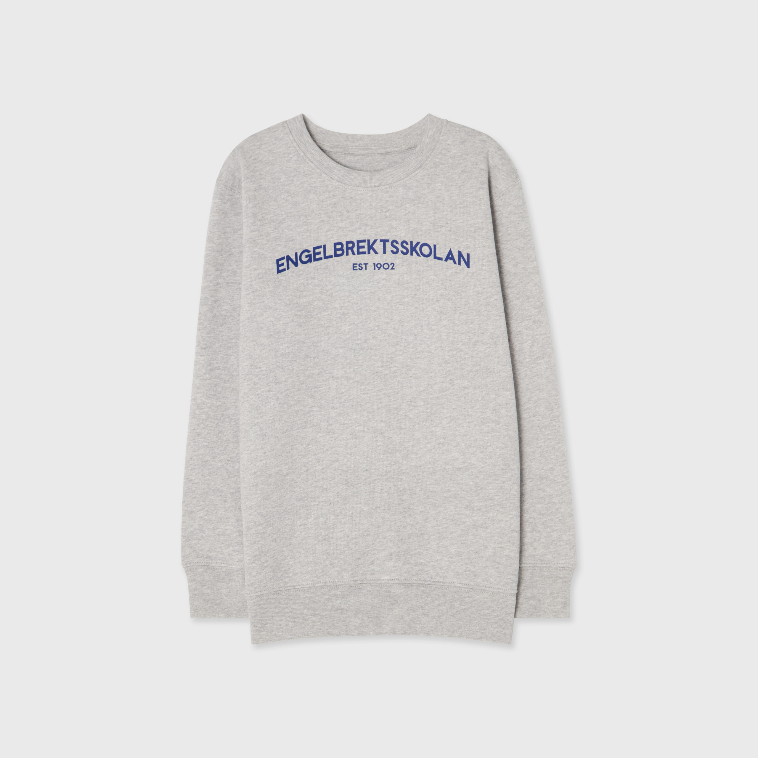 Grå sweatshirt med Engelbrektsskolans textlogotyp på bröstet.