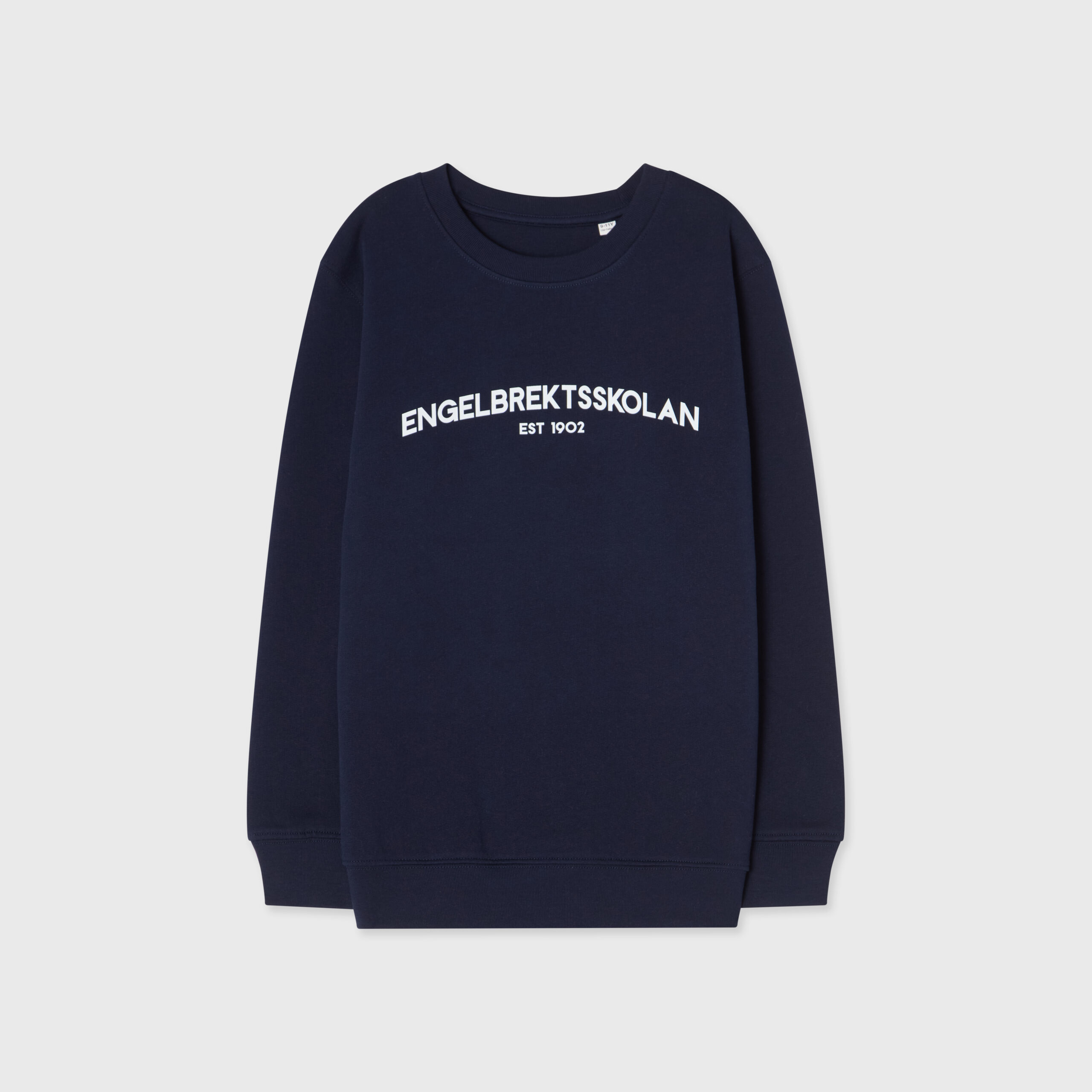 Navy sweatshirt med Engelbrektsskolans textlogotyp på bröstet.