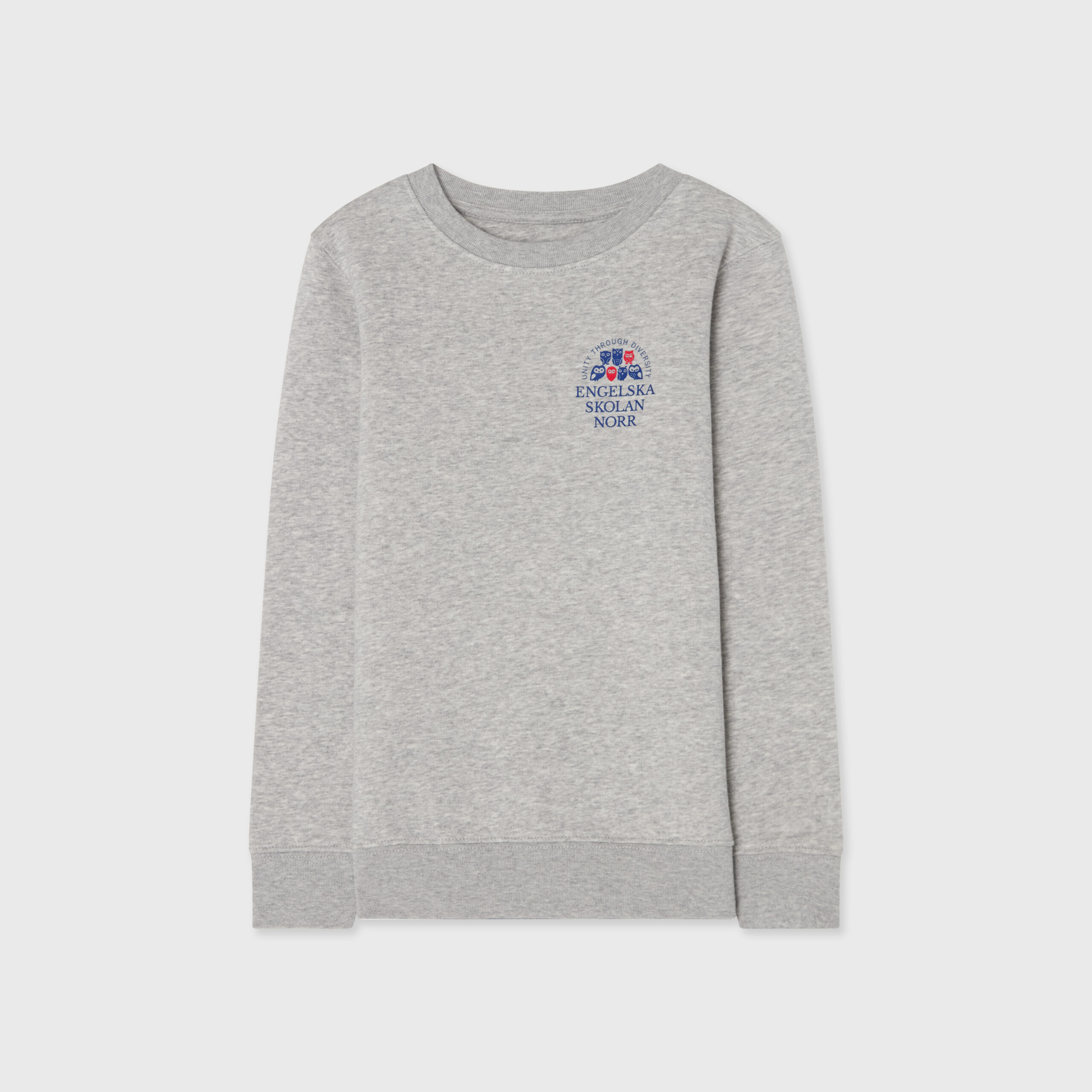 Grå sweatshirt med Engelska skolan norr logotyp på vänster bröst.