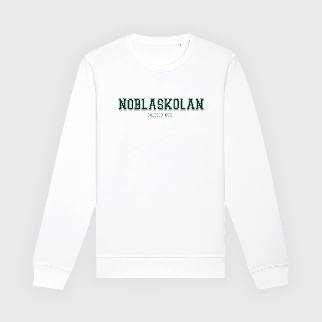 Vit Sweatshirt med Noblaskolan på bröstet i grön färg.